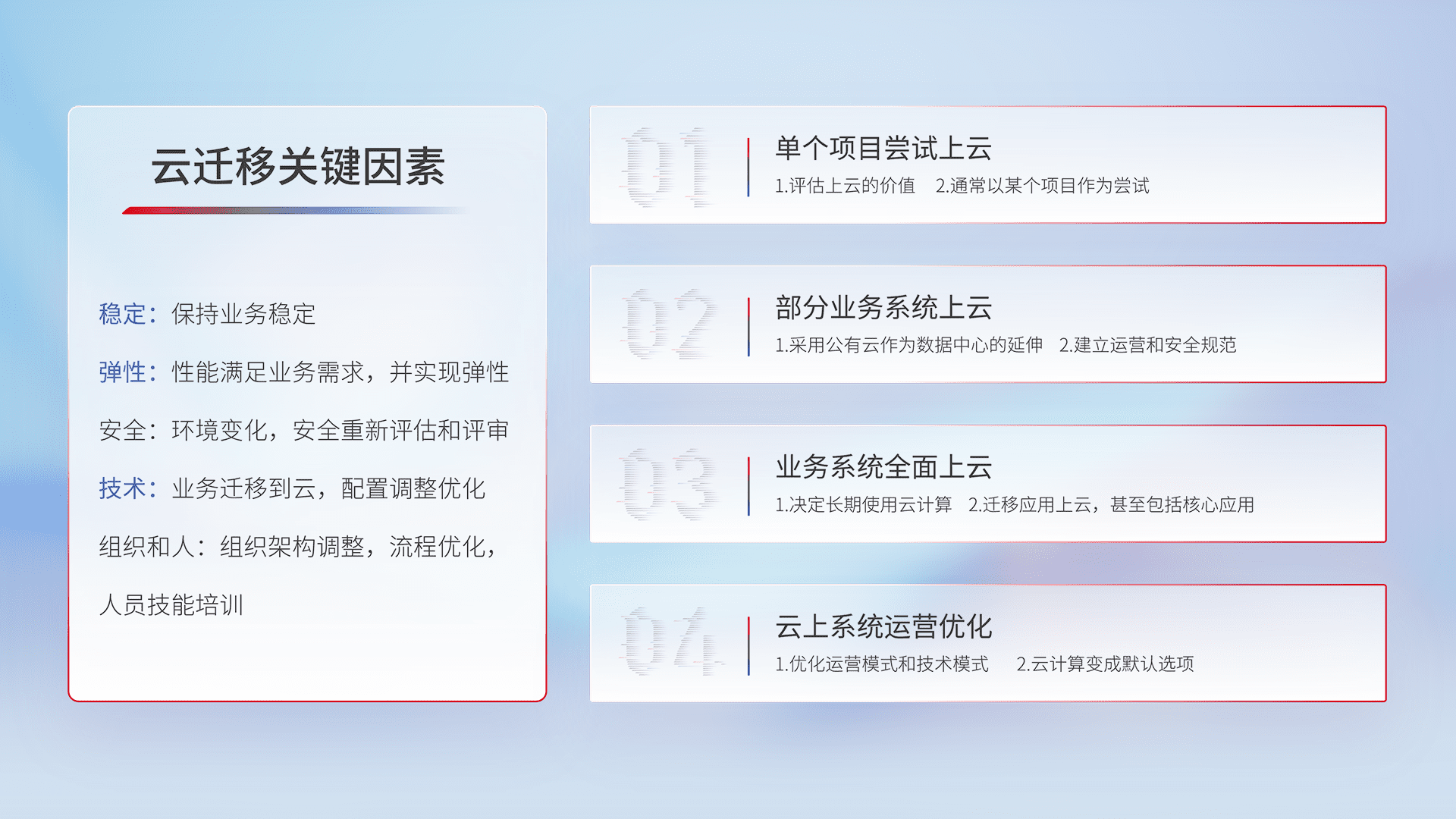 结合实际业务,,从规划设计、、、、云平台选型、、、云原生改造、、、、数据迁移、、集成交付,,,,迁移全过程为客户识别最佳上云路径,,,,做好风险识别管理,,,设计网络架构、、身份权限、、安全审计合规、、操作审计、、、日志审计、、监控告警策略、、、多站点容灾设计等,,对云上基础设施进行整体规划,,,提升IT治理水平,,,以满足弹性、、、、高可用、、、、高性能的需求。。。。