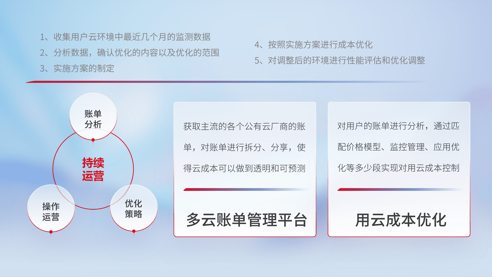 通过多云纳管,,,,以统一的资源数据模型把客户的云资源进行抽象和封装,,,进而实现对多云资源的统一操作,,保障云资源管理的可靠性、、、、稳定性与可用性。。。量身定制化运维内容,,配置、、开发运维、、、补丁管理、、、、备份、、、监控、、、、认证和访问管理、、审计和日常巡检等,,保障在用云过程中的可靠度,,,,稳定度以及高可用率。。