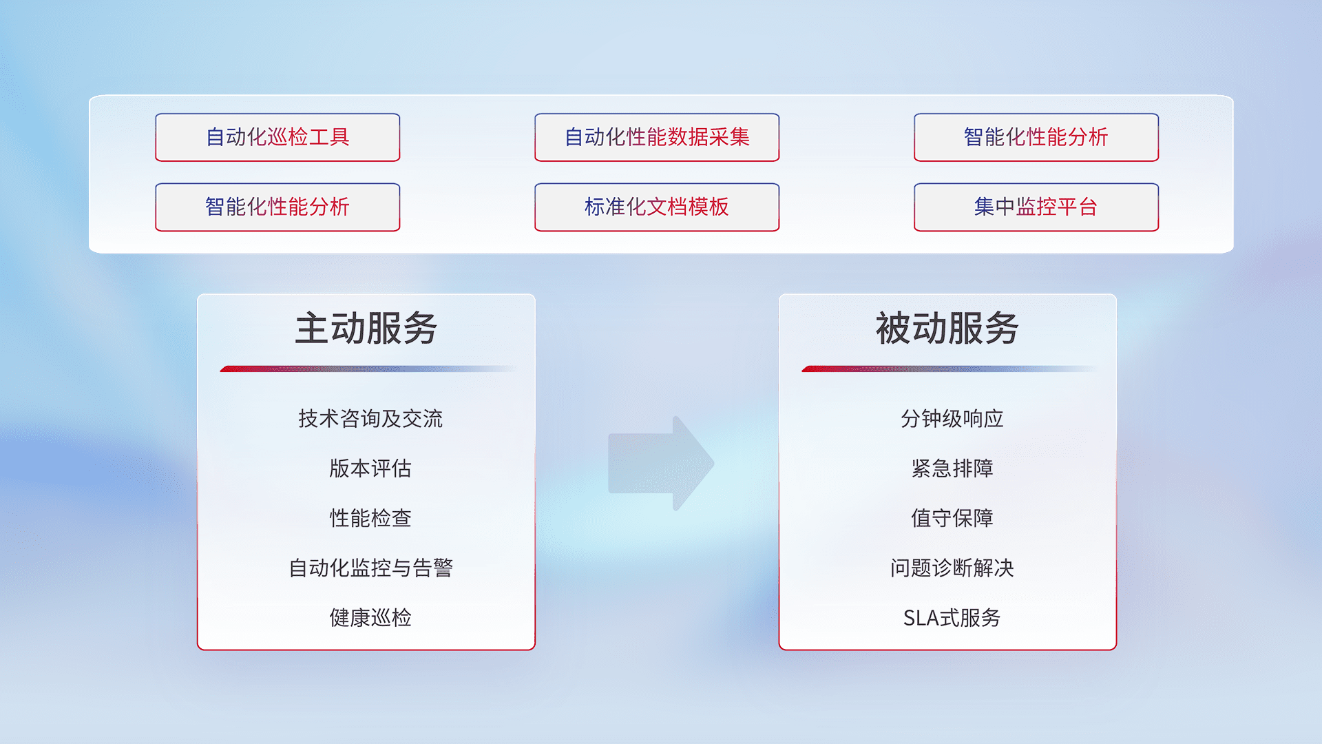 智能化工具和标准化文档,,,,保障服务质量,,提供主动服务(包含技术咨询、、、、版本评估、、、性能检查、、、、自动化监控与告警、、、、健康巡检)和被动服务包含(分钟级响应、、紧急排障、、、、值守保障、、问题诊断解决、、SLA服务)。。。。
